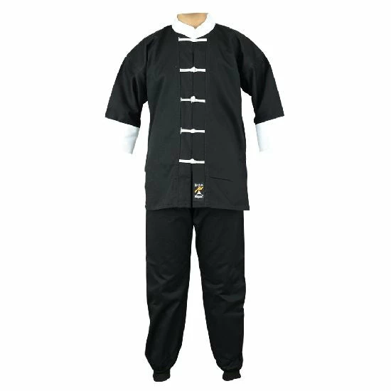 Black kung fu suit with White Collar and Cuffs and white Toggle Fasteners to Jackets. 100% Cotton.kung fu Trousers with Elastic and Cord Waist for all sizes and Elasticated ankle. Excellent kung fu uniform made with the finest bleached cotton. Traditional kung fu outfit. All our Kung Fu suits are medium weight and top quality and we can assure you there is no other match to Playwell suits.