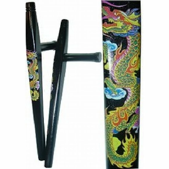 Wooden Tonfas Made of Hardwood, With Colourful Dragon Imprint. Total Length 20 Inches. Handle Lenth approx 5 inches. Diameter Length Approx 1.2 inches. Sold in pairs