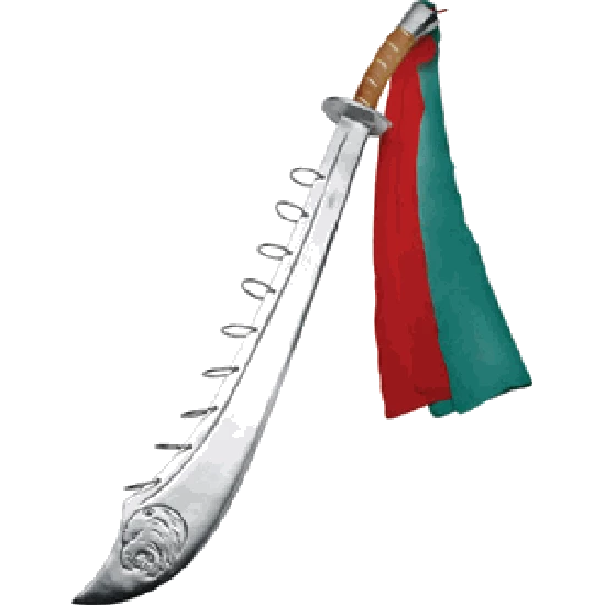 This mean looking sword has an etched lion head and nine fastened rings. Made of die-cast aluminum. Red and green sashes attached to the leather wrapped handle. Scabbard not included. Total Length Approx 33 inches. Handle Length approx 6.5 inches