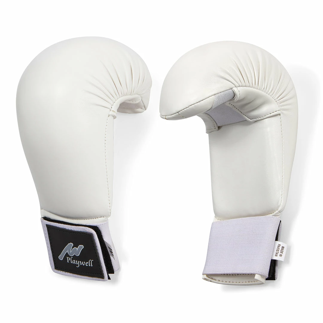 Karate protective gloves, made of High Qualty Syntec Leather. Inside palm of strong cotton, filled with latex with round elastic velcro closing. White In colour