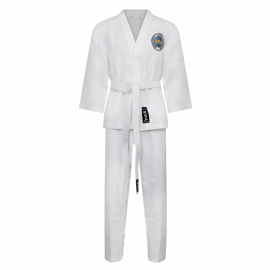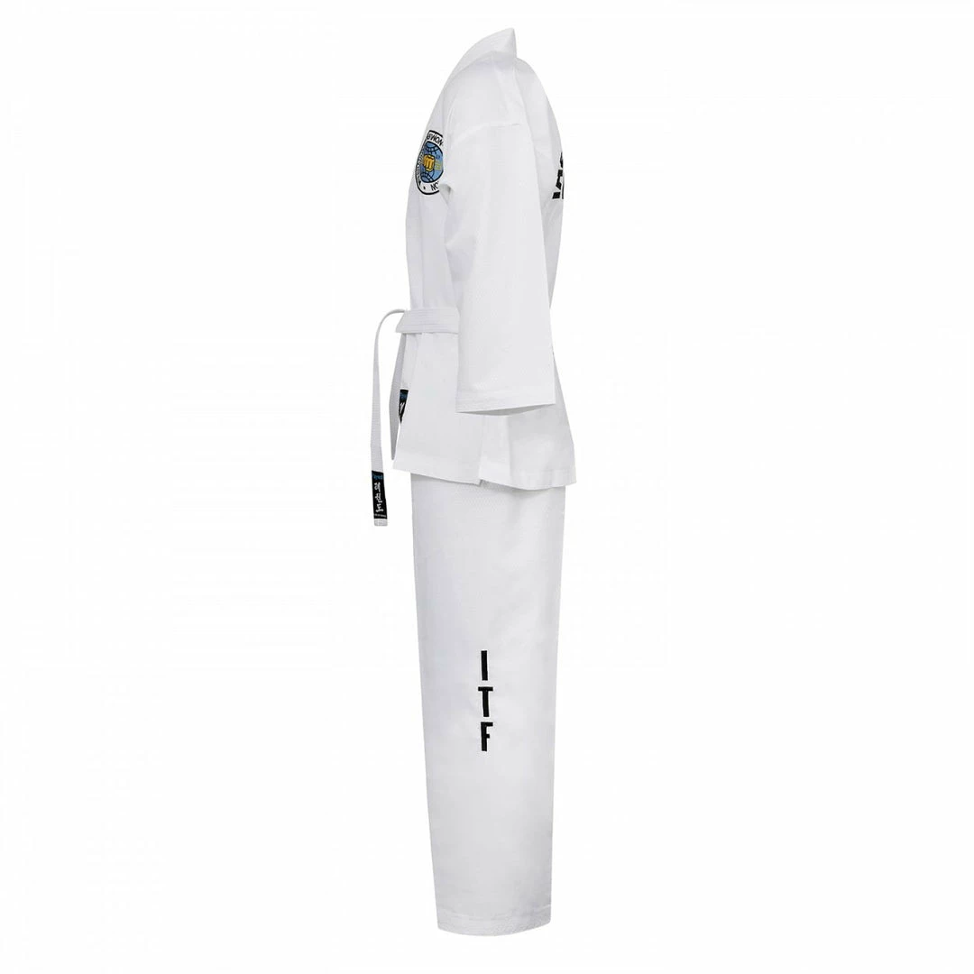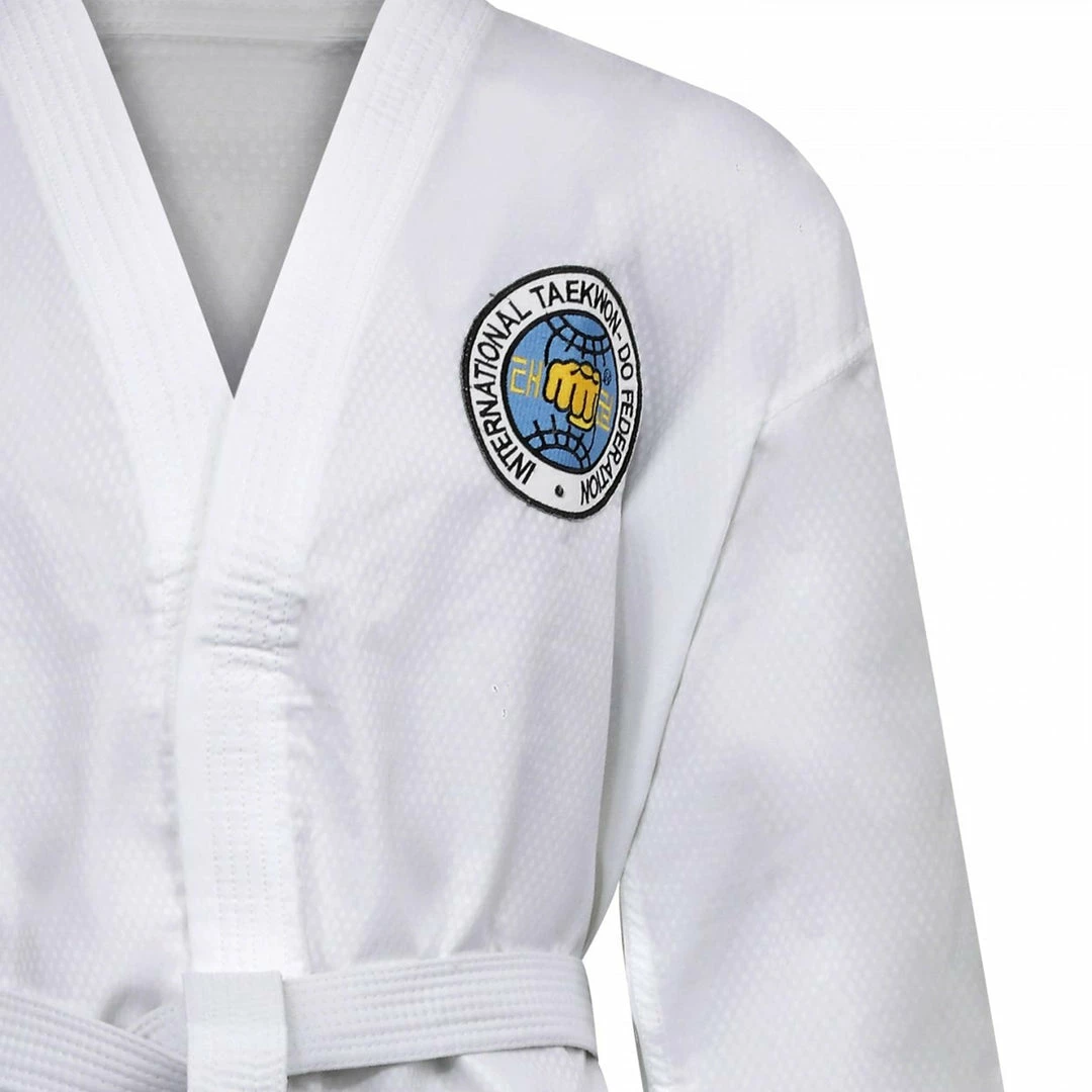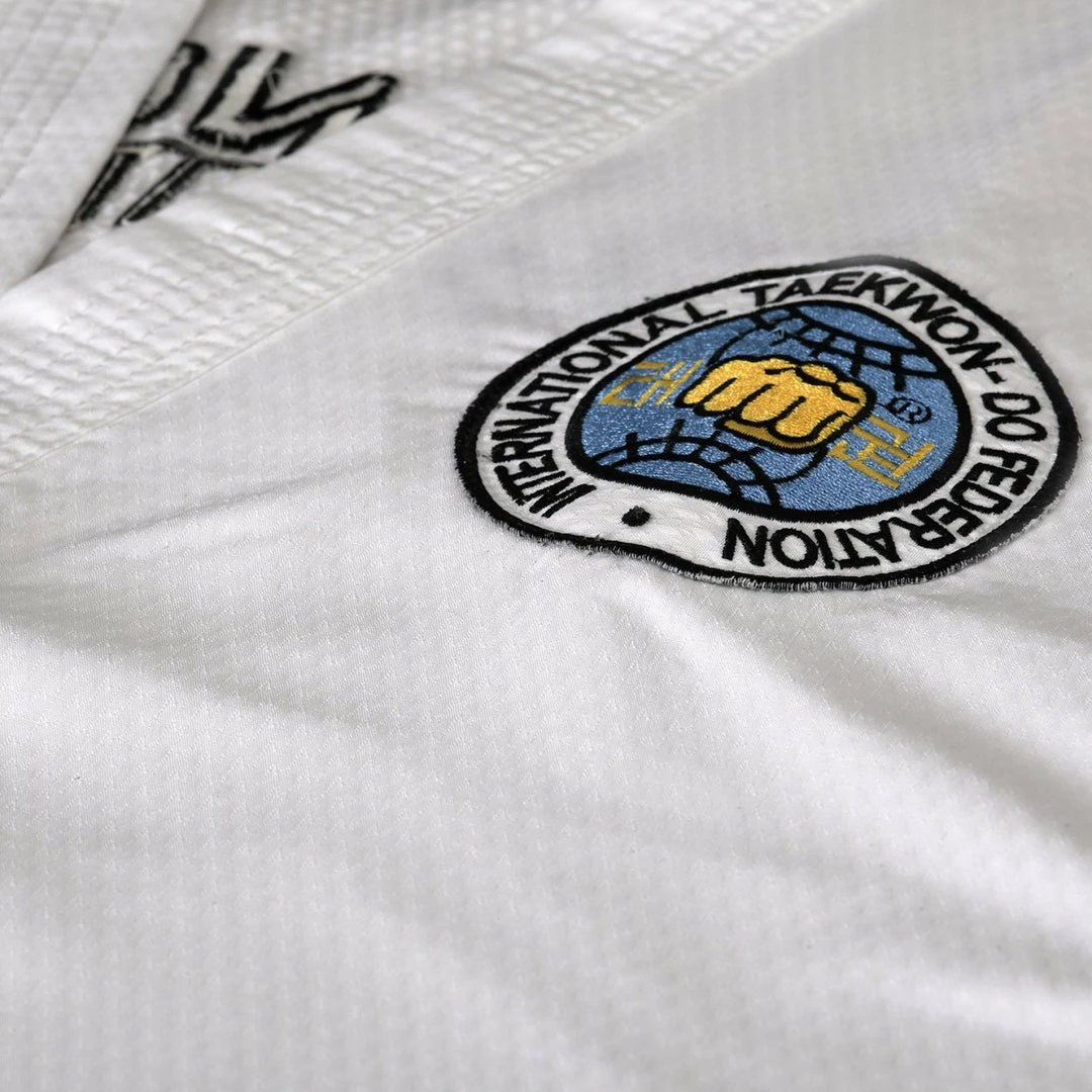 This uniform is made from Ultra Light Polyester Diamond Fabric, It has been specially designed for International Taekwondo Federation sparring and competition.
