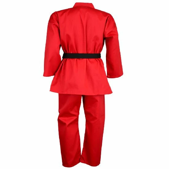 Karate Red Club Uniform . Constructed from 7.25oz Polyester/Cotton Middleweight twill. Pullover top features V-neck, side vents for ease of movement. Pants have elastic and a draw string.