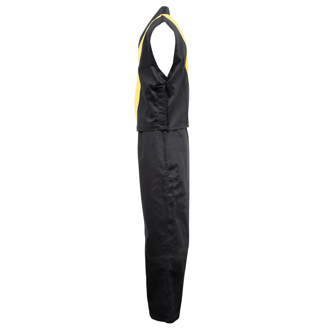 Sleeveless Splice Uniform, in a pattern design with a choice of colour. Black with Red splice , Black with Yellow Splice. New from Playwell, designed for instructors or as a club uniform. Constructed of 9 oz Polyester/ Cotton Middleweight twill. Pullover top features V-neck, side vents for ease of movement. Pants have elastic and a draw string.