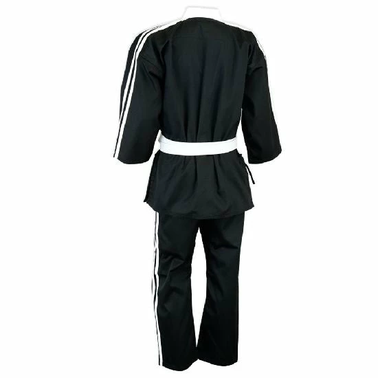 Stripe Team Uniform Great for exhibitions and tournaments. Constructed of middleweight 65% polyester, 35% cotton wash and wear fabric. Traditional jacket has fuller cut, inside ties and constrasting lapel (except black). Pant has 1-1/2 inch elastic waist and drawstring. Double stripe down the jacket sleeve and pant leg Trouser will be same design as the top.