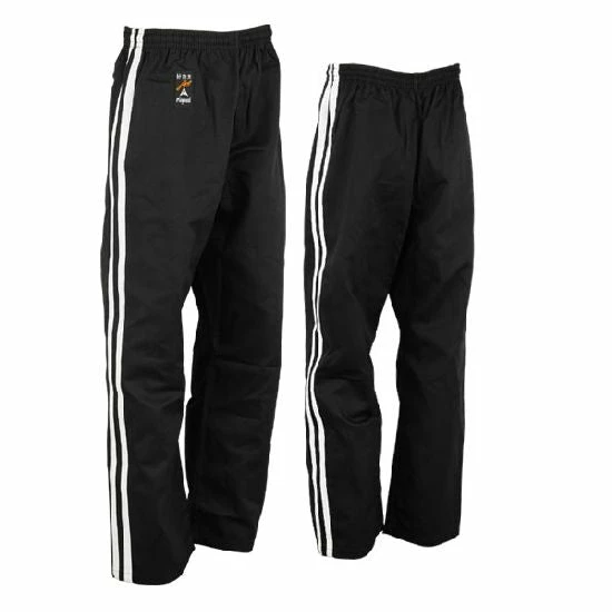 Full Contact Trousers Made of 100% Lightweight Satin. Suitable for All styles of Martial Arts. With Elasticated Waistband. Trousers Are all Black in colour with 2 contrasting White stripes on both sides of the trouser.