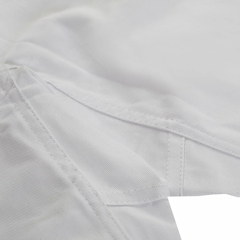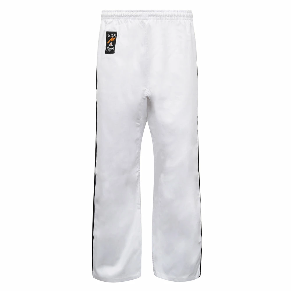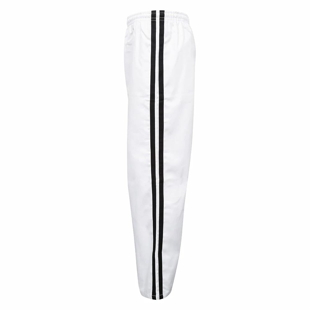 Medium Weight Full Contact Trousers, Suitable for All styles of Martial Arts. Made of 100% cotton. With Elasticated Waist band. Trousers are all white in colour, with to contrasting black stripes on both sides of the trouser.