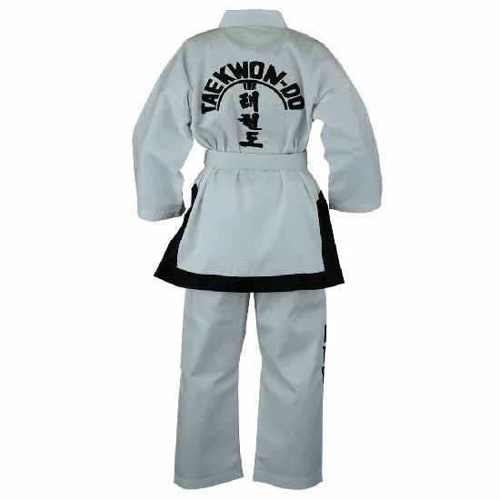 65% Poly 35% Cotton. Black belt trim along the bottom of jacket. ITF “tree” on back and ITF on pant. Full embroidery ITF badge on front.