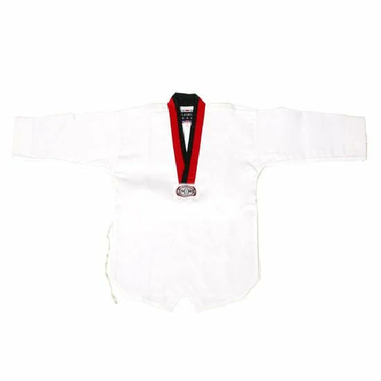 New Ultimate Korean uniform. POOMES. The best Dobby fabric in the market, previoulsy worn by the Korean Tigers and Olymic champions now all playwell students are wearing this new Dobby fabric with pride and Joy. Dobby Fabric, light weight and with a woven ribbed cotton effect. Black / Red V-NECK : FULL EMBROIDERY: Taekwondo In English and Korean , with WTF logo patch . Feel proud wearing this New Playwell Design Dobby Fabric uniform. The most competitive Uniform in the market.