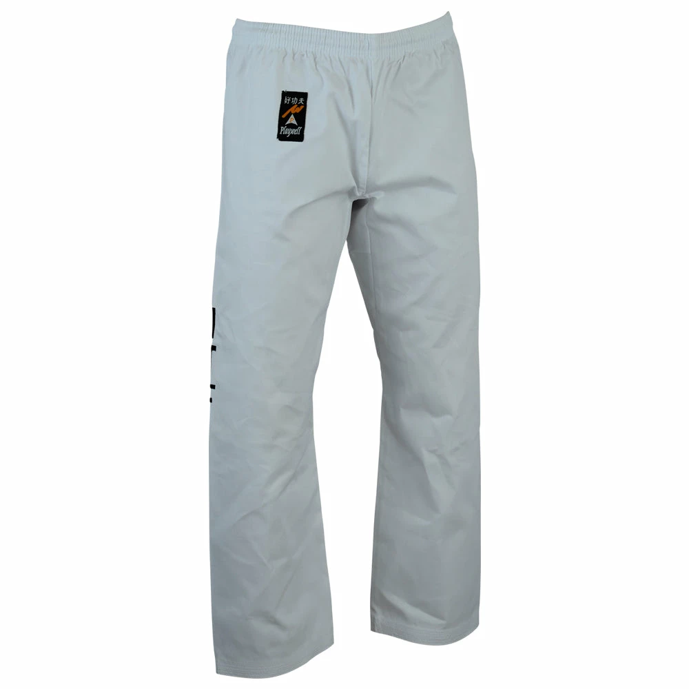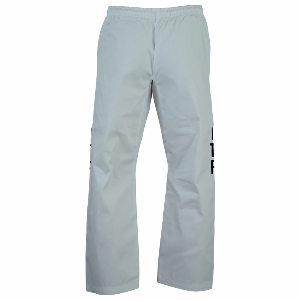 Available for a limited Time Only. Itf Taekwondo Trousers, in White made of Polycotton, With ITF Lettring Screen Printed On Both Sides of the trousers. Comes with elasticated Draw String Waist.