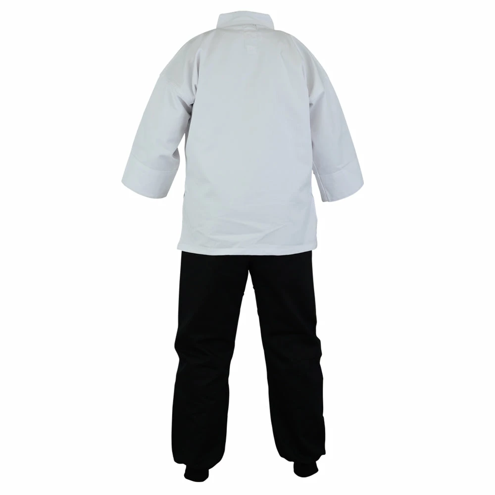 Kung Fu suit All White top with black elasticated trousers and traditional cuffed ankles. 100% cotton Excellent Kung Fu uniform made from the finest bleached cotton. Traditional outfit. SASHES SOLD SEPARATLEY If You Require An Alternative Mix Uniform Please Call Playwell