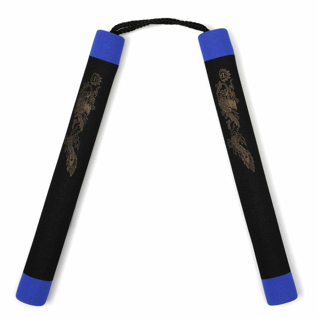 Nunchucks Made of Foam With nylon cord.Two tone: Blue and Black with Deluxe dragon design. Length of handles approx 12 inches, Diameter of handles approx 1.2 inches. Length of cord 4 inches. Great for Beginners