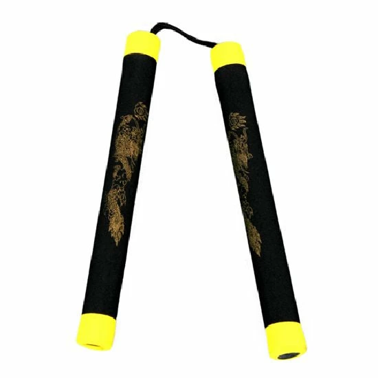 Nunchucks Made of Foam With nylon cord. Black / Yellow Tips with Deluxe dragon design. Length of handles approx 12 inches, Diameter of handles approx 1.2 inches. Length of cord 4 inches. Great for Beginners Colours and Designs of Foam Nunchaku Subject to availability. As a Measure of safety and law why not store your Nunchaku in our deluxe nunchaku cases……………….