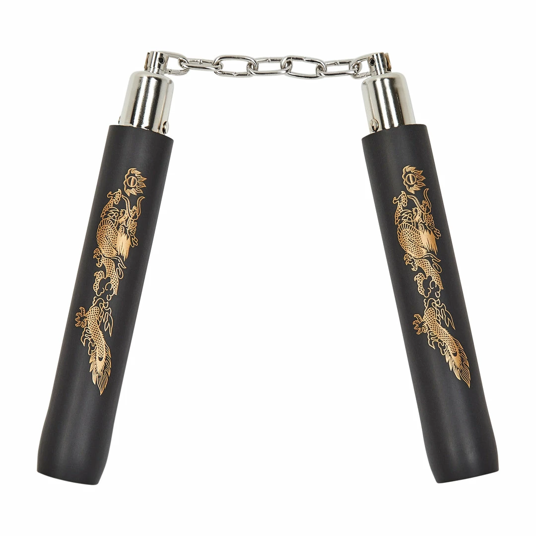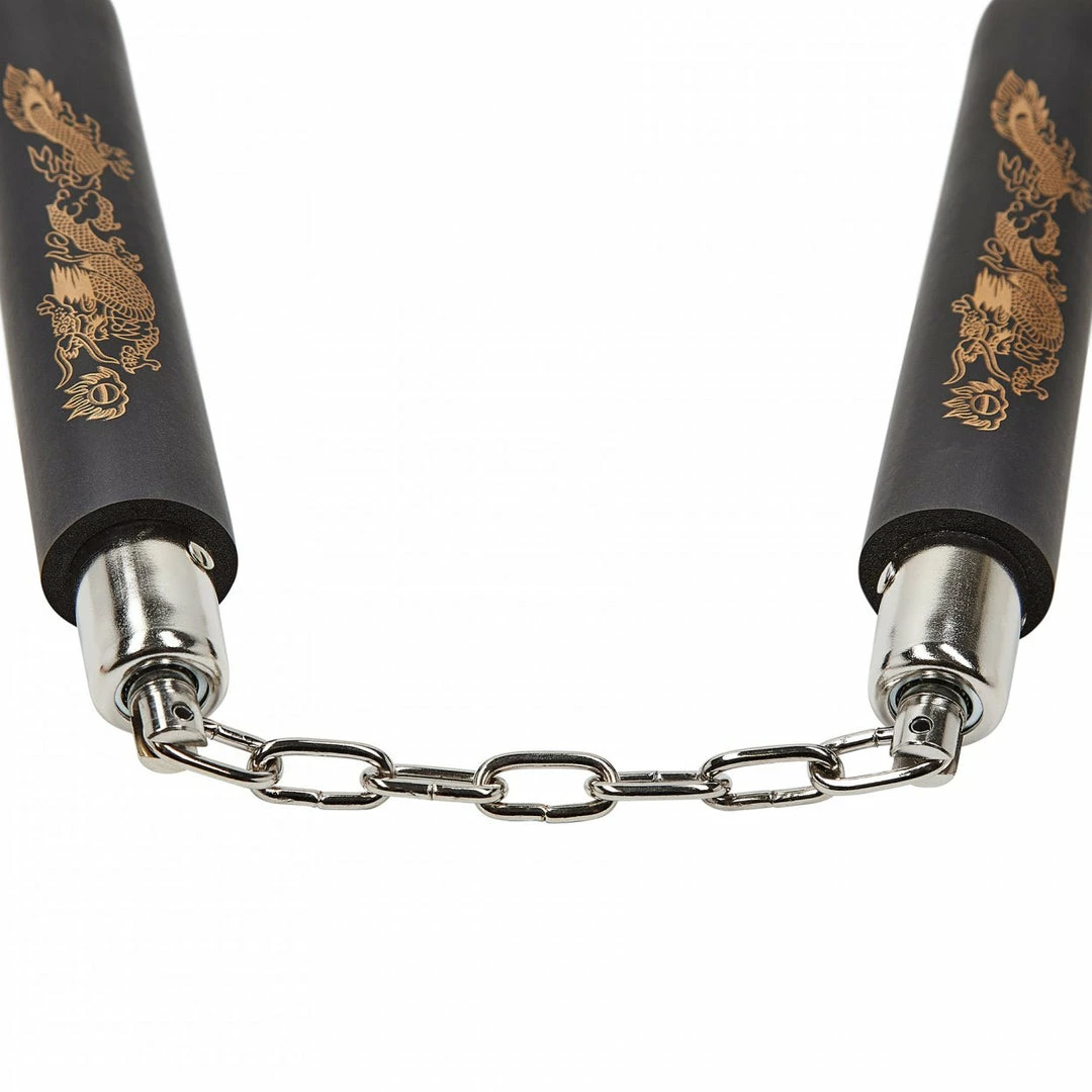 Foam Nunchucks for children All Black with Dragon Design Nunchucks made of foam With Metal Ball Bearing Chain. Diameter of Handles approx 1.2 inches, Length of Handles 8inches, Length of Chain approx 5.5 inches (7 links in chain). Great For Beginners, Children, Ladies Available With Metal Chain Or Cord.