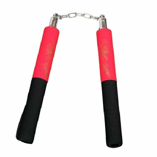 Nunchucks made of foam With Metal Ball Bearing Chain. Two tone half red and half black with Dragon Imprint. Diameter of Handles approx 1.2 inches, Length of Handles 12 inches, Length of Chain approx 5.5 inches (7 links in chain). Great For Beginners.