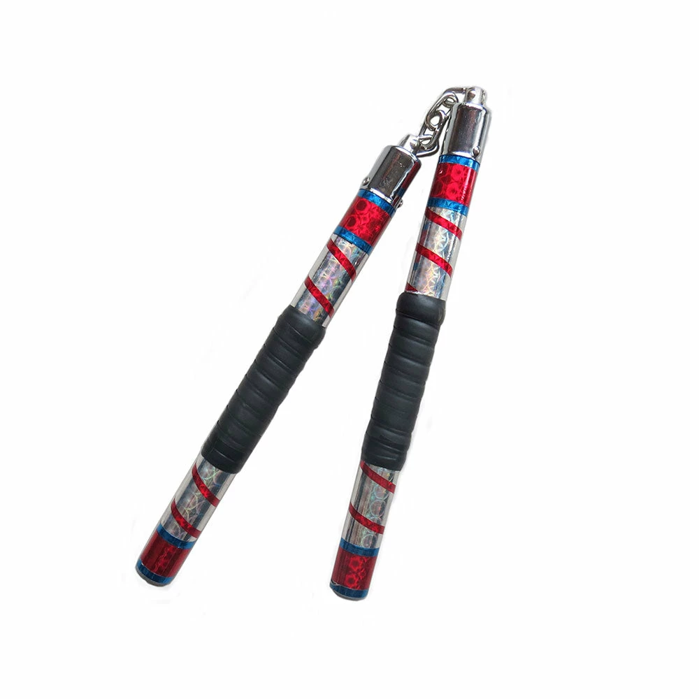 Eye catching large spiral striped tape accents these lightweight nunchaku white wood lotus handles with ball bearing attachment. . Details: Length: 12 inches Chain: 4 link chain Diameter: .9 inch