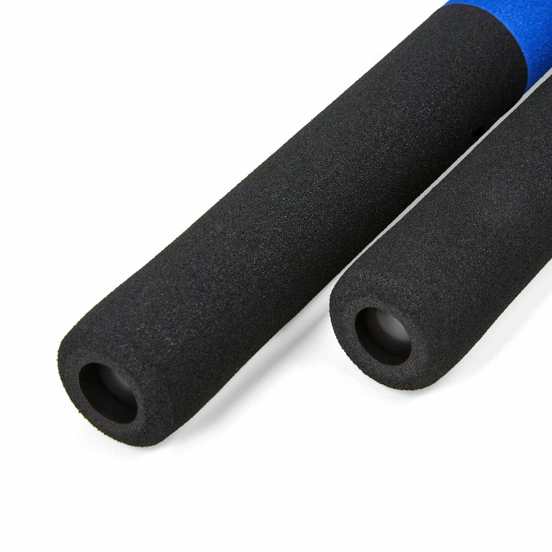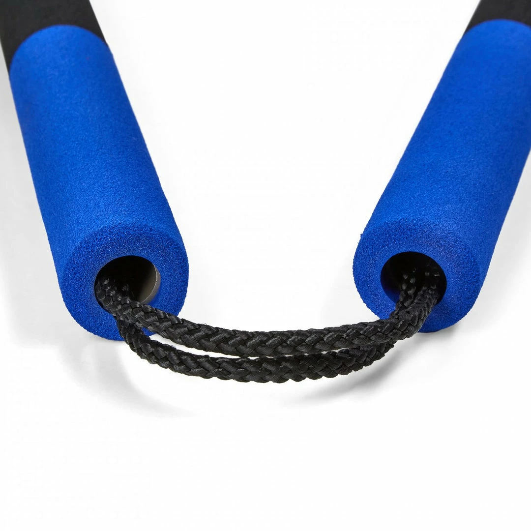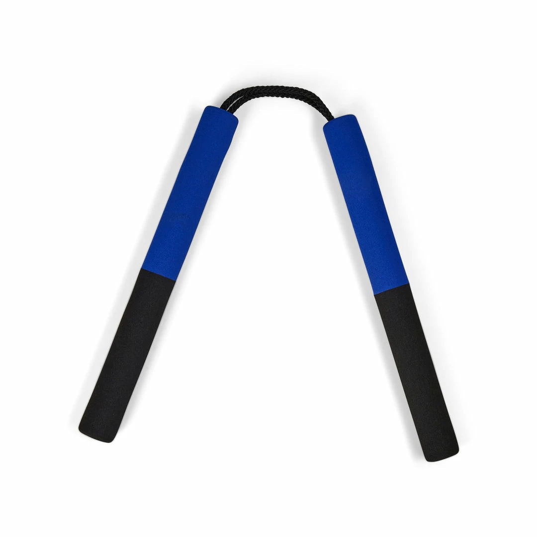 Nunchucks Made of Foam With nylon cord.Two tone: Blue and Black with Deluxe dragon design. Length of handles approx 12 inches, Diameter of handles approx 1.2 inches. Length of cord 4 inches. Great for Beginners