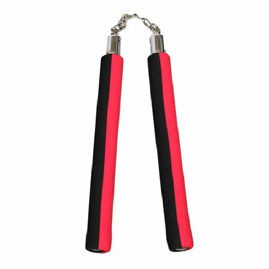 Nunchucks made of foam With Metal Ball Bearing Chain. Two tone Vertically half red and half black. Diameter of Handles approx 1.2 inches, Length of Handles 12 inches, Length of Chain approx 5.5 inches (7 links in chain). Great For Beginners. Colours Subject to Availability. ………………..Best Seller As a Measure of safety and law why not store your Nunchaku in our deluxe nunchaku cases……………….