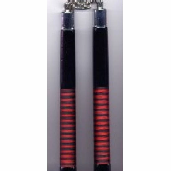 Black Nunchaku made of Wood with Red String on handles. Total Length of Nunchuck handles on each side 12 inches. Length of chain approx: 5.5 inches (7 links in chain), Diameter Length approx: 1.2 inches. Colours of Strings Red or Green. Subject to Availability. As a Measure of safety and law why not store your Nunchaku in our deluxe nunchaku cases……………….