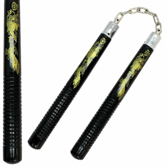 Nunchaku made of wood, with metal ball bearing chain. Colour black with Golden Dragon imprint. Grooves on handles for firm handling. Total length of handles on each side of nunchaku 12 inches, length of chain approx: 5.5 inches, diameter length approx: 1.2 inches. Best Seller As a Measure of safety and law why not store your Nunchaku in our deluxe nunchaku cases………………