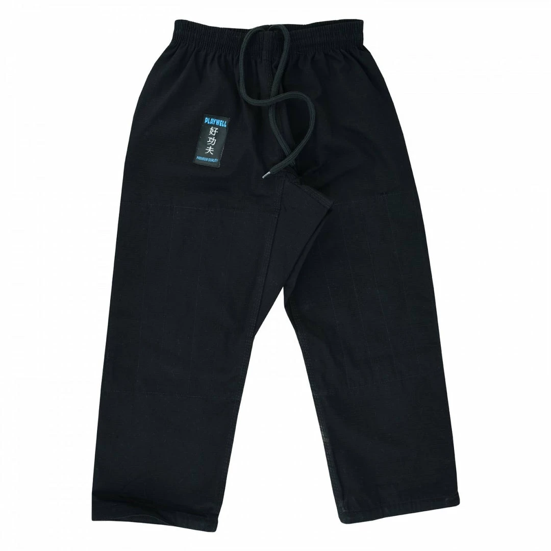The jacket is a 380 gram pearl weave pre-shrunk cotton. The weave of the fabric also ensures that it will not rip even when put through its paces. The triple stitching across stress points provides lasting durability. The 8oz Rip Stop pants are also made from pre-shrunk 100% cotton. The pants feature a triangular extension at the crotch to bring you a full range of motion during competition.