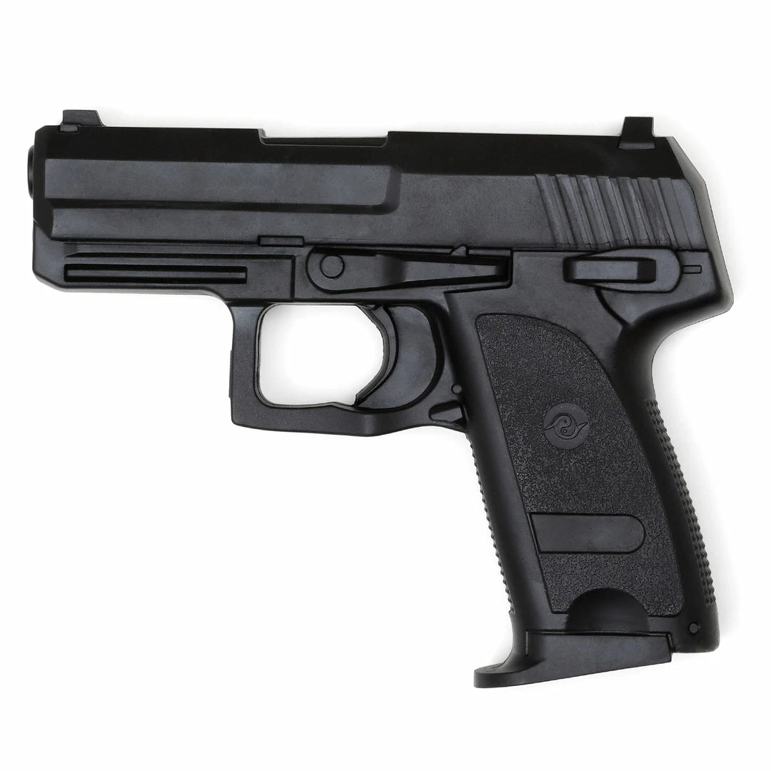 Black rubber hand gun replica with mock trigger. Realistic design by Playwell for use and training in method of non-deadly force. Measures: 7.5 inches in length and 5 inches width. Weighs 1 pound. Colour of the gun is subject to Black