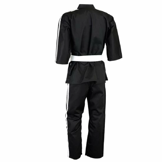 Stripe Team Uniform Great for exhibitions and tournaments. Constructed of middleweight 65% polyester, 35% cotton wash and wear fabric. Traditional jacket has fuller cut, inside ties and constrasting lapel (except black). Pant has 1-1/2 inch elastic waist and drawstring. Double stripe down the jacket sleeve and pant leg Trouser will be same design as the top.