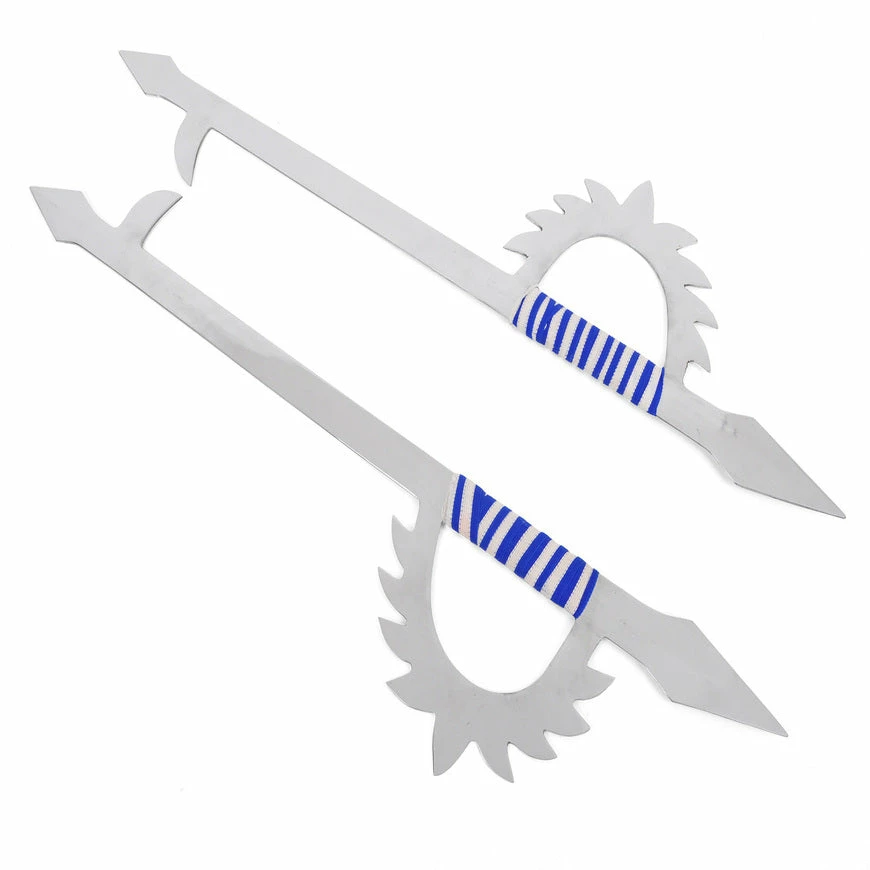 These are some of the most exotic of Chinese weaponry pieces. Oftentimes they are used in pairs, as they are very lightweight and easy to handle. They are fast and maneuverable and carry with their strokes a deadly capability (though ours are unsharpened). Their hand guards, which are bristling with nine, small, tooth-like blades give them their well deserved name. 34″ overall length 1.4 lbs each