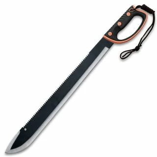 When it comes to survival, there’s no time for playing around. You need a blade that won’t let you down, and the powerful Colombian Rescuer Sawback Survival Machete from United Cutlery is the constant companion you’re looking for! The massive, 18” full-tang stainless steel blade has a non-reflective black coating and powerful sawback serrations ready to tackle any challenge or obstacle. The razor-sharp blade edge is satin-finished and there is a lashing hole at the end of the blade. The machete has an orange and black rubberized injection-molded saber-style handguard handle that is secured to the blade tang by sturdy screws. The 24” overall machete fits securely into a sturdy nylon belt sheath for ease of carry and the handle has a wrist lanyard. You won’t find another machete at any price that can get the job done better! Brand United Cutlery Weight 18.72oz (530.7 grams)