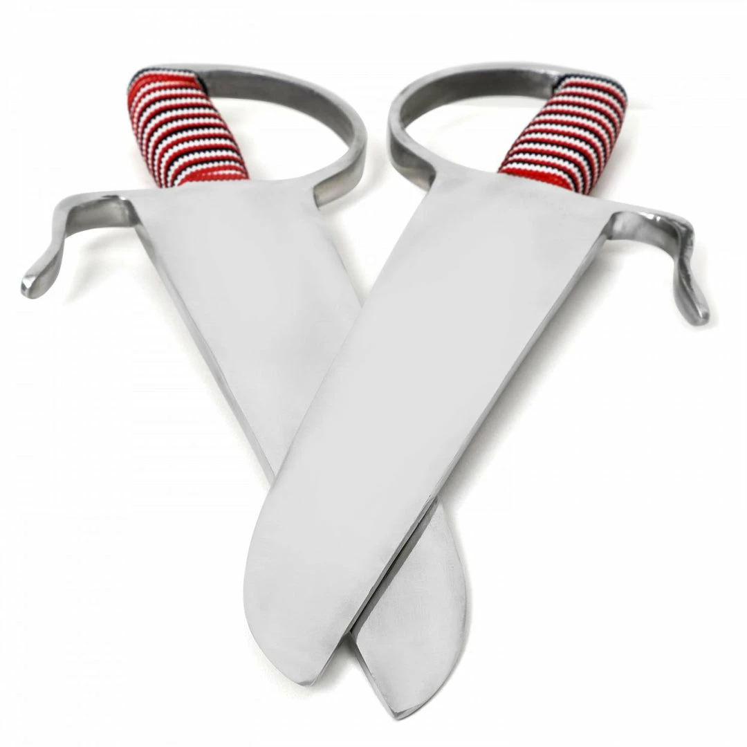 Made of tough Aluminium. Length of handle approx 4 inches. Blade length approx 12. Total length of wing chun knife 16 inches. Distance between the loops approx 1.3 inches. Sold in Pairs. Weight 960g ( Total weight of pairs ) –