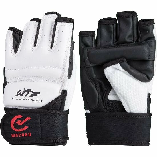 WTF APPROVED Hand protectors for competition use, made by Wackou. These hand Protectors. Comfortable elasticised glove with pu reinforcement and velcro close WTF approved logo and fingerless design. Colour is White.
