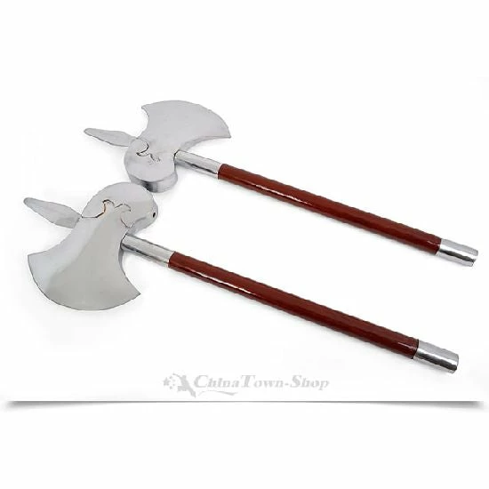 Nice double short axes made from plated steel. A nice feature of these axes as opposed to others is the tapered butt section which gives these axes a much greater feel of quality than the normal straight end cap. Single blade axe. 41 inches. Sold in pairs